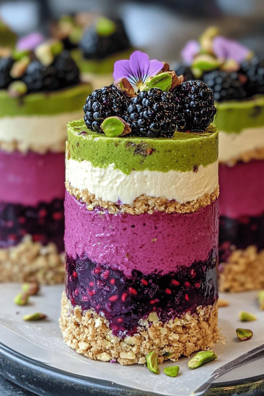These Pistachio & Blackberry Cheesecake Towers are versatile enough to suit any gathering. From birthday parties to holiday celebrations, they fit right in. Their mini size makes them easy to serve and enjoy, allowing guests to indulge without feeling overwhelmed. Plus, they can be made in advance, giving you more time to enjoy the festivities.